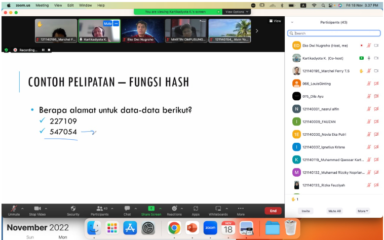 Dalam kuliah tamu kali ini, narasumber, Ibu Kartikadyota Kusumaningtyas, membahas mengenai konsep hashing. Ibu Kartika menekankan bahwa dalam memilih fungsi hash, penting untuk mempertimbangkan kecepatan dan kesederhanaan, serta menghindari kompleksitas yang dapat menyebabkan distribusi data yang tidak merata di sepanjang jangkauan indeks array. Pemilihan fungsi hash yang terfokus pada indeks tertentu harus dihindari untuk mencapai sebaran data yang optimal.