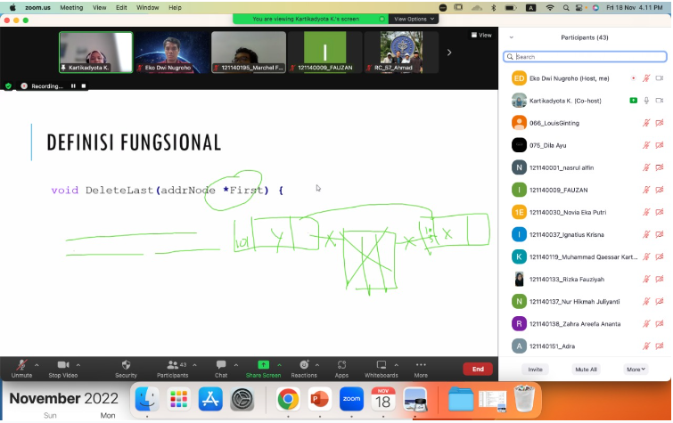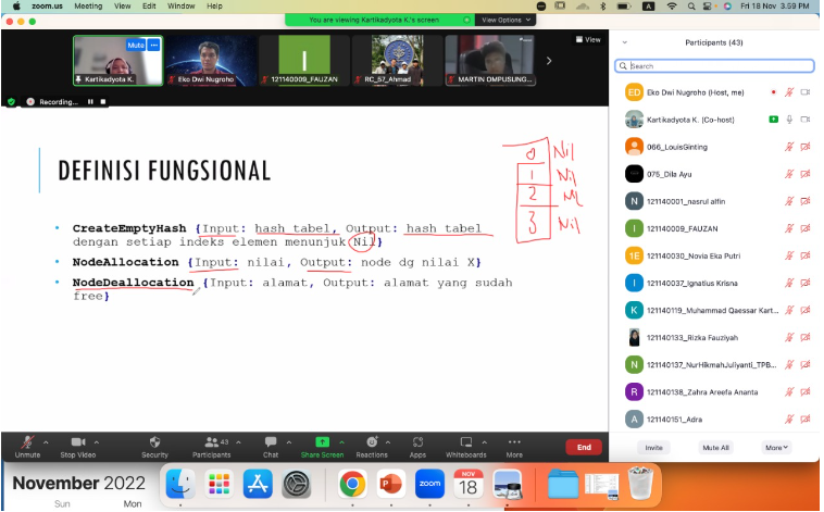 Selanjutnya, Ibu Kartika menjelaskan mengenai hash table. Hash terdiri dari beberapa elemen yang dapat dikenali melalui beberapa alamat, seperti alamat yang menunjuk node pertama dari setiap elemen dalam hash yang ditunjukkan oleh FIRST, serta alamat node berikutnya yang dapat diperoleh melalui NEXT. Alamat elemen hash ditunjukkan melalui indeks, di mana setiap node yang terhubung ke elemen hash memiliki alamat yang dapat diacu. Misalnya, jika H adalah Hash, i adalah indeks, dan P adalah alamat, kita dapat menggunakan notasi First(H, i) untuk mengacu pada alamat node pertama dari indeks tertentu. Informasi yang tersimpan dalam node dapat diakses dengan menggunakan notasi selektor, seperti Info(P) untuk nilai yang disimpan dan Next(P) untuk alamat node berikutnya. Sebuah alamat hash dianggap kosong jika First(H, i) = Nil, dan P dikatakan sebagai node terakhir jika Next(P) = Nil.